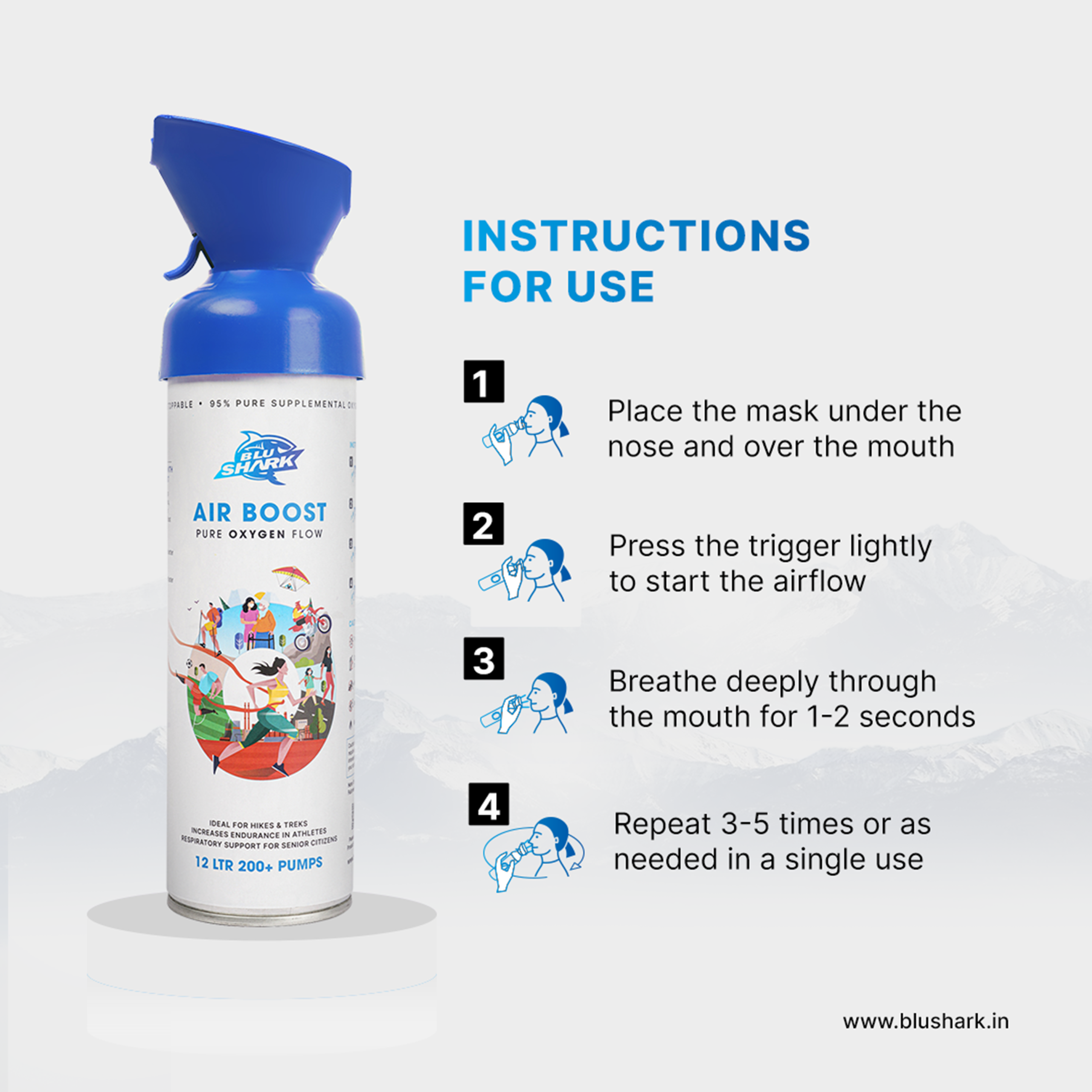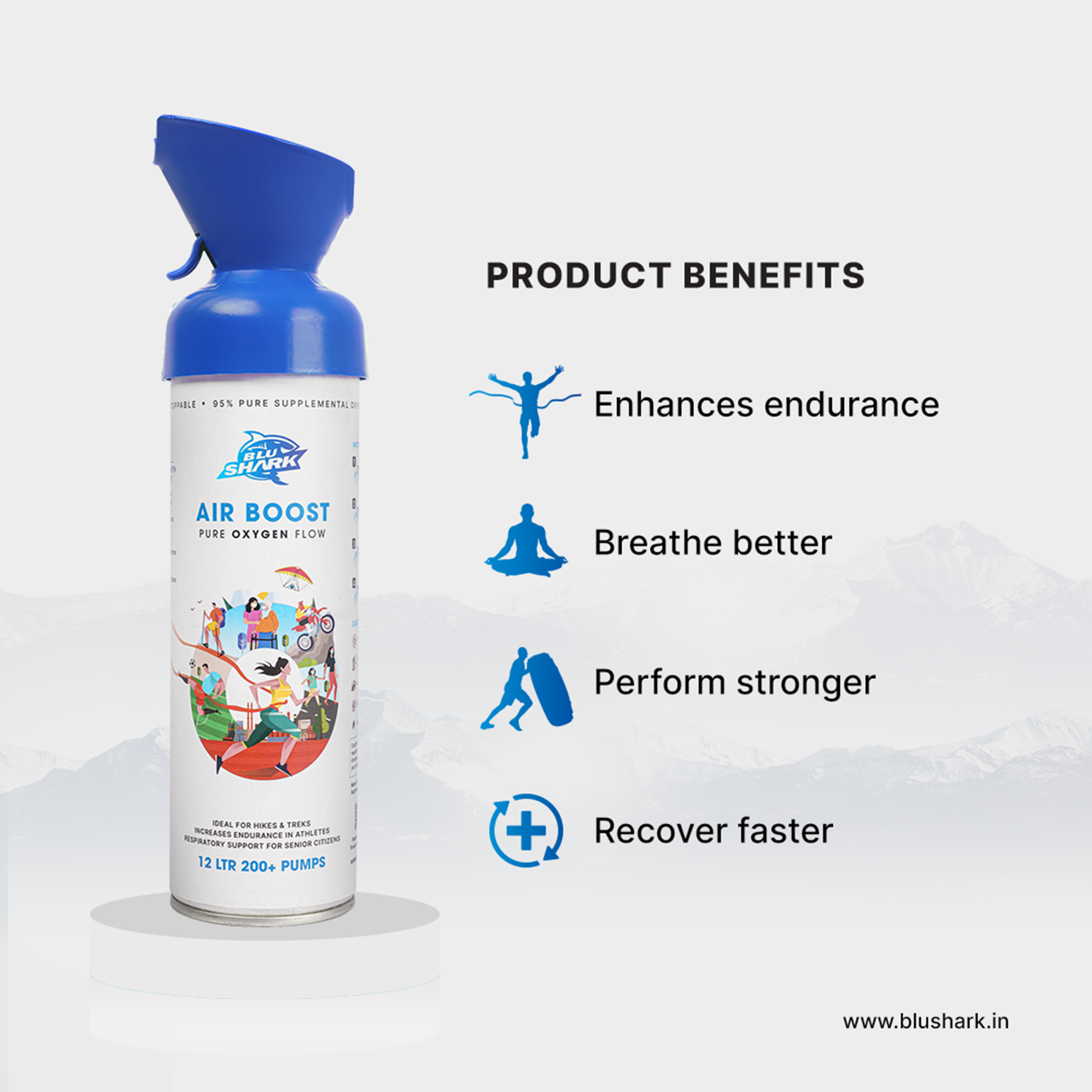Elevate your energy and well-being with BluShark Oxygen — a breakthrough personal oxygen solution made for life on the move. Whether you’re scaling a mountain, recovering after an intense workout, or fighting mid-day fatigue, BluShark delivers a crisp burst of 95% pure oxygen with every inhale, helping you recharge and feel revitalized instantly.